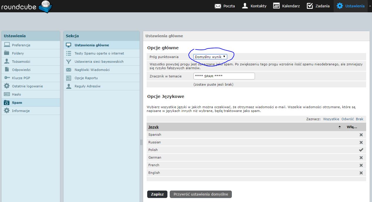 Możesz zmienić wartość Progu punktowania w zależności od swoich obserwacji. Jeśli uważasz, że zbyt dużo maili zakwalifikowanych jest nieprawidłowo jako spam, zwiększ wartość progu. Jeśli uważasz, że otrzymujesz zbyt dużo nieprzefiltrowanego spamu, zmniejsz tę wartość.